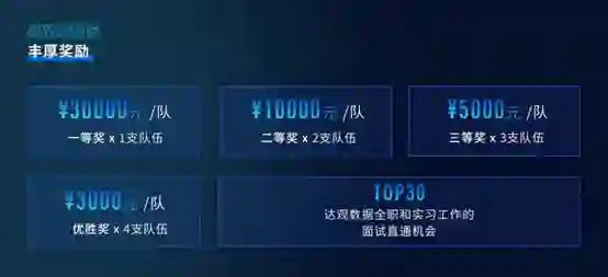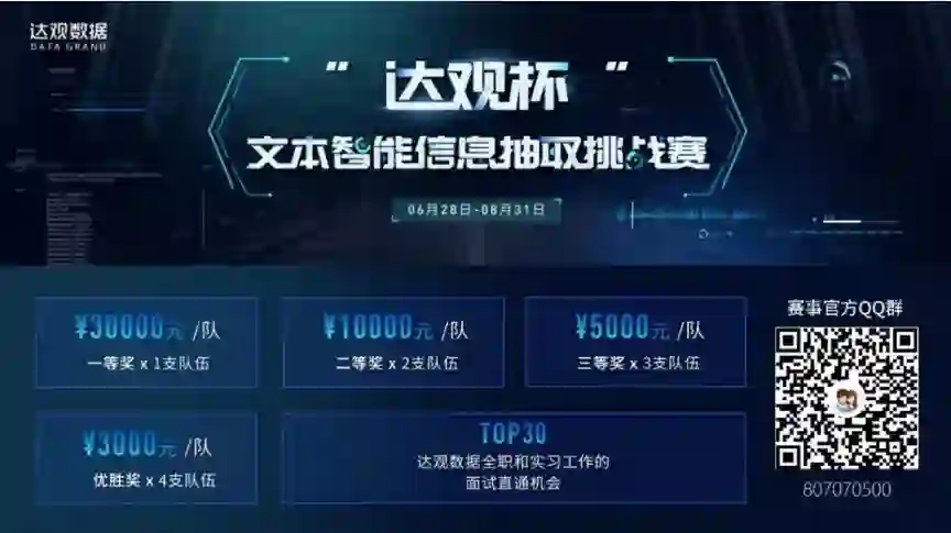 最后,看完了这篇文章能做什么呢?可以参加我们的“达观杯”文本智能信息抽取挑战赛。这是我们第三次组织“达观杯”比赛。比赛的一等奖有30000元奖金,二等奖2支队伍有10000元的奖金,三等奖有5000元的奖金,优胜奖还有3000元。除此之外,TOP30同学直接直通面试。