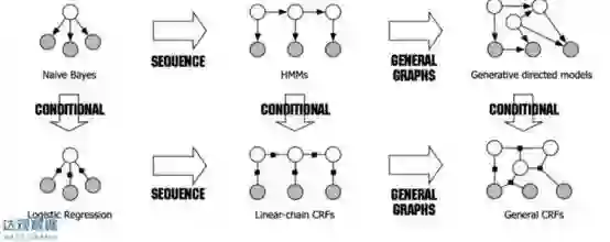 在实际应用中我们用的最多还是条件随机场(CRF)。因为CRF往往效果更好。下图说明了HMM和CRF的关系是什么,我们可以看到一个HMM是链式传递,但加上一个条件就是我们最常见的链式条件随机场。通用CRF就是下图中右下角的图,但是我们做序列标注的话可能是最下面一行中间的这个图,也就是链式的CRF。它跟上面一行的图的区别是什么?大家可以看到下面一行图中有好多小的黑色正方形,这就是我们说的条件。我们是如何得出条件的?下面我们就来介绍一下如何通过真实训练得到条件。