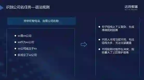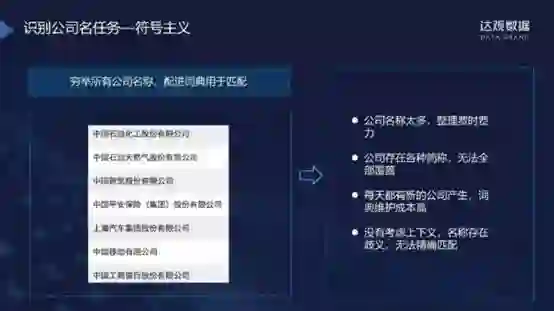 如果从历史的角度来说,识别公司的任务就是所谓的“符号主义”任务,简单来说就是穷举所有公司的名称做词典匹配。这样就是一个命名实体。但是,这么做场景其实有限。为什么?因为上市公司的集合是有限的,所以直接拿公司字典可能比训练模型更快。