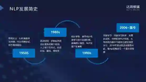 其实自然语言处理的历史非常悠久,甚至出现在“AI”这个概念之前,最早叫“符号主义”。刚开始的时候人们选择了一个很不好的场景:机器翻译。机器翻译是一个难度很大的任务,因为涉及了语义的理解和不同语种语法的规则。所以早期自然语言处理不是很成功。过了20-30年,到上世纪80年代开始,我们使用了语法规则,基于自然语言处理的一些基本原理,再通过人工在这些语法的规则上进行修订,做了一些问答、翻译和搜索方面的尝试。