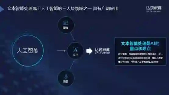 下面我们开始介绍一下文本挖掘。下图中,我们可以把人工智能分为三类——图像、文本和语音,达观是一家专注于做文本智能处理的科技公司。文本相对于图像和语言来说更难处理,因为文本数据需要做一些逻辑分析。图像和语音属于感知智能,而文本属于认知智能,所以号称是“人工智能的明珠”,难度很大。
