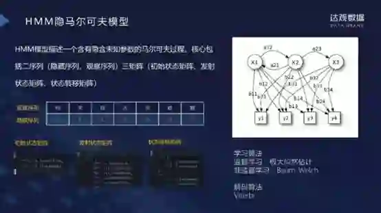 HMM是我个人学的第一个模型,但是我现在基本上不用这个模型。为什么不用?因为它的效果还是相对差一点。但它也有优点。因为做极大似然估计就是简单的统计,速度非常快。所以这个模型的更新可以做到秒级。你做一个数据的修改,跑一遍立刻把数据统计出来,修改矩阵以后很快就对这个模型做一个更新。所以在项目的初始阶段,我们可以快速地用这个方法来做baseline或者动态的修改。尤其在实际业务中,可能客户做了一些修改后他需要实时知道反馈,这时候可以用HMM,虽然可能不能保证有好的效果。