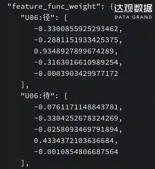 这里我们用了一个比较简单的特征模板,取了离当前字最远的前3个字和后3个字,以及它们之间的组合特征(如U07到U09这几行)。我们可以看到这个模板其实特别简单,一共只有16个特征。这种选择和我们标注好的训练集性质有关。如果研究过比赛的训练集,就会发现数据中的实体是比较简单的,不会涉及特别长的文本抽取,所以这里正负3已经可以取到一个比较好的特征了。我也试过用再复杂一点的模板去做,但是效果不如这个简单的模板好。