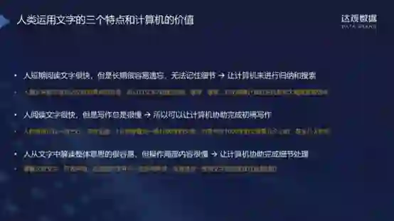我们对比一下人类和计算机之间的差异。其实我们人类短时间内阅读理解文字的能力还不错,但是时间久了很容易遗忘。但计算机基本不会忘,只要硬盘不坏。人脑难以长期记忆,但我们对内容的推理能力比计算机强。因此,我们可以请计算机来做一些比较细节的工作。例如文字比对,我们检查错误要逐字逐句地看,非常累。计算机能做到秒看,却很难做复杂的逻辑和推理。