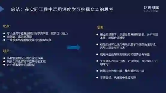 我们总结一下本文内容。在实际工作中,到底怎么来用深度学习挖掘文本?最重要的一点是要用预训练模型,通过非监督数据训练向量,提升泛化能力。虽然中间步骤难以分解,但因为深度学习有端到端的能力,所以对中间步骤要求较低。而且,深度学习能克服一些传统模型的缺点,例如LSTM的上下文依赖就比CRF强。