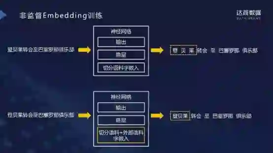 下图是我们的一个真实的例子。当时登贝莱刚转会到巴塞罗那俱乐部。我们用标准语料去训练,发现“登贝莱”这个名字一定会被切开,无论怎么训练分词都不行。潜在的解决方法之一是增加很多登贝莱相关的标注数据,但是这么做收益不足。所以我们就找了很多外部的语料做嵌入。