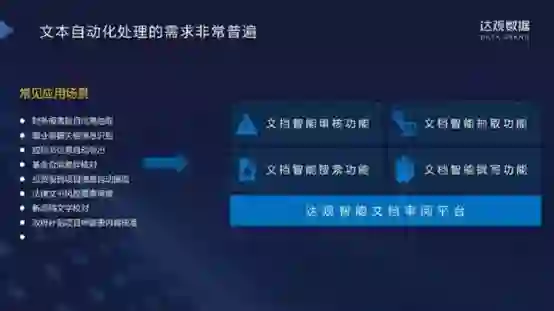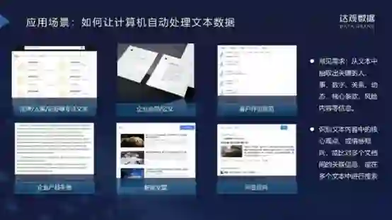 应用场景一般就是客户提供的文档,包括财务报表、基金合同等等。文档处理的核心是自然语言处理,特别是抽取技术。我们也需要考虑实际应用,结合一些其他的工程技术,比如外部系统、分布式技术、数据库技术等等。