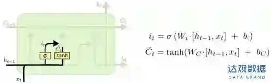 当前输入包括上一时刻隐层的输出和当前的输入。这一步骤判断应该留下来多少内容。它还是计算两个系数,一个i_t,这也是一个0-1之间的值。第二个是C_t,表示当前cell的状态。计算完毕后需要把这两个系数的值保存下来。