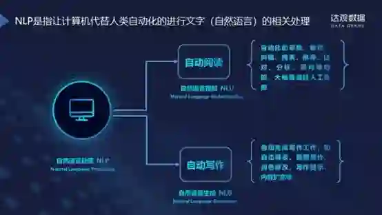 自然语言处理的任务是什么?简单来说就是让机器知道怎么看、要么写。我们一般把“看”叫自然语言理解(NLU),包括自动化审核、自动文本比对、信息纠错,搜索推荐等等,它可以大幅度减轻人工的负担。自动写作叫自然语言生成(NLG),包括自动填表、生成摘要,文本润色,还有大家看到的“自动生成股市”、“自动生成对联”等等。目前我们主要还是在解决自然语言理解的问题。语言生成因为一些限制,实际落地的效果仍然有待提高的。所以我们今天主要讨论自然语言理解这部分。