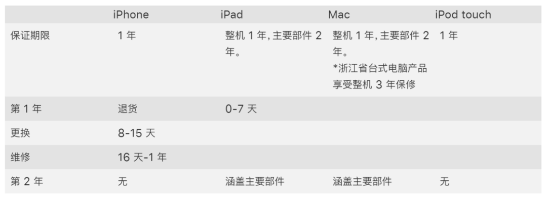 这里简单概述一下:在不购买 AppleCare+ 的情况下,iPhone、Apple Watch 和 iPod touch 从购买之日起 1 年内享有整机质量问题保修服务;Mac、Apple 显示器、iPad 和 HomePod 从购买之日起 2 年内享有主要部件质量问题保修服务(浙江省台式电脑是 3 年);有线耳机从购买之日起 3 个月内享有质量问题保修服务。