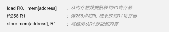 对专用处理器来说,指令集的设计直接反映了对应用需求的理解。比如,第一篇中介绍的例子,如果我们的专用处理器只是为了加速256点的FFT用的,那么指令集里只有FFT指令就够用了。考虑到数据搬移的需求,再加上几条数据搬移的指令,比如读取数据,写回数据。于是可以得到一个有三条指令的指令集(fft,load,store)。这个处理器执行的汇编(Assembly)程序大概就是这样的。