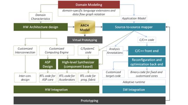 硬件架构设计还要输出一个架构模型。而这个硬件架构模型也是整个设计方法中重要的一环。一方面,这个架构模型可以生成虚拟原型系统(Virtual Prototyping);另一方面,它也是程序代码映射工具(Source-to-source mapper)的输入,而代码映射功能用于将一些特殊的模型转换为C/C++这类传统的编程语言(这类语言有很好的工具进行处理),同时输出Analysis Annotations,用于指导硬件设计和软件工具链的前端设计。