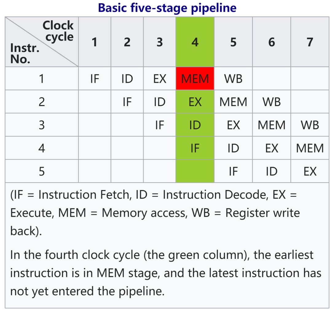 当一条指令,完成了“取指”操作,开始进行“译码”的时候,取指模块就可以取下一条指令了,这样可以让这些模块不至于闲着没用。wiki对指令流水线的示例如下(IF:取指;ID:指令译码;EX:执行;MEM:访存;WB:写回):
