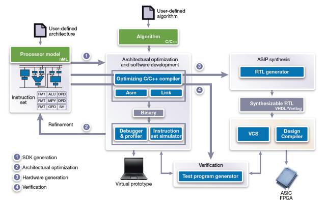 它的输入就是两个,算法(C/C++代码)和处理器模型(Processor Model),输出则是一个处理器相关的所有设计和工具链。从输入到输出的过程同样是自动化完成的。当然,这个过程并不像看起来那么简单,处理器建模的门槛不低。而且,工具赋予你的灵活性越高,掌握这种工具的门槛也越高。ASIP designer的处理器建模需要使用一种专门的语言,即nML,对处理器的指令集和架构进行高层次建模;此外还需要很多和编译器相关的设计。所以,即使你能买得起,要玩好这套工具,还得具备两个条件:第一,是你必须熟悉处理器架构和编译方面知识;第二,是要学习这套建模语言和工具。