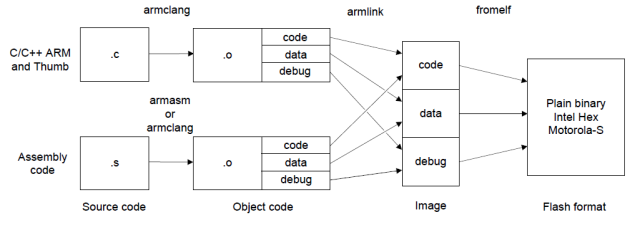工具软件:主要包括编译工具(compiler),调试工具(debugger),仿真工具(simulator)和性能分析工具(profiler)。下图是ARM的编译工具的例子,主要包括armclang(C编译器),armasm(汇编器),armlink(链接器)和fromelf(image工具)。