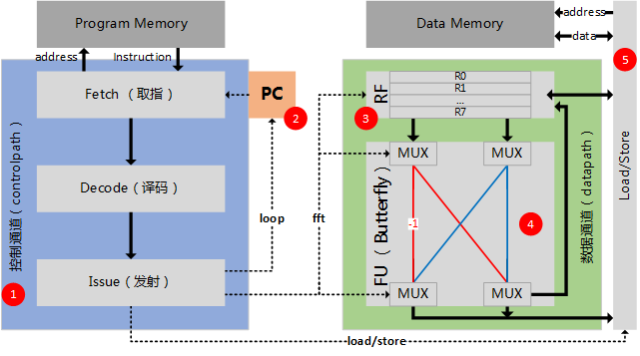 首先,我们要执行的关键指令是fft指令,这里假设fft指令就是做一次蝶形运算(buffterfly)。所以我们要有一个做蝶形运算的硬件单元(图中的4)。而这个功能单元FU(Functional Unit)需要输入和输出数据。数据了来源可能是通用寄存器堆RF(Register File,图中的3),也可能是memory或者流水线寄存器。同样,数据的输出也有很多可能。因此,需要一些MUX来进行选择。简单说,图中的3和4就构成了处理器中的数据通道(datapath),也就是处理数据的通路。另外,为了把数据从数据存储器(data memory)中读进来进行处理(load),或者将处理的结果再写回到存储器,还需要一个“load store单元”(图中的5)。