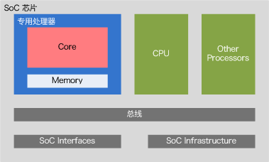 由于专用处理器这个名称可以用在很多地方,我想再明确一下本文说的专用处理器设计的范围:1. 我们主要讨论IP级的设计,也就是说专用处理器设计最终作为一个SoC(System-on-Chip)芯片中的IP出现。它需要和其它模块合作完成整个芯片要实现的功能(下图为一个简化模型)。2. 我们主要讨论的专用处理器是要运行程序的,有自己的指令集(可能很简单,比如Google第一代TPU,主要指令不超过10条),需要有存储程序的空间和读取指令,执行指令的机制。