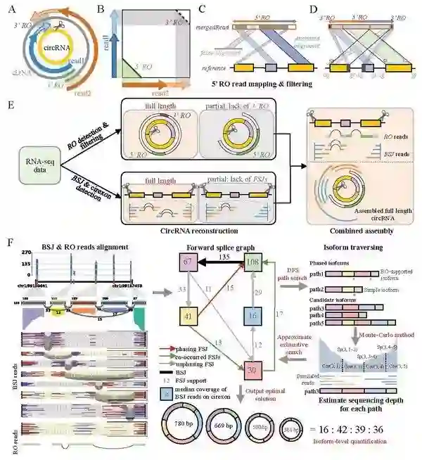 在以往的研究中,环形RNA的识别方法主要是利用环形RNA特有结构——反向剪接序列特征进行识别。然而,由于二代测序的读长普遍较短,研究者们虽然可以获得大量的反向剪接位点,却无法高通量获得环形RNA的完整内部结构信息,也无法对不同可变剪接产物进行精确定量。为了解决该问题,赵方庆团队首先提出了一个新的环形RNA识别特征——反向重叠区(Reverse overlap)。该特征通常出现在读长较长的环形RNA测序中。与以往的所有识别算法不同,该特征不仅可以用于判断转录本双端测序中的一对测序序列是否来自于环形RNA,也可以用于判断该序列是否可以覆盖整个环形RNA。研究人员利用该方法从不同哺乳动物的脑组织中获得超过80%的环形RNA的全长序列。