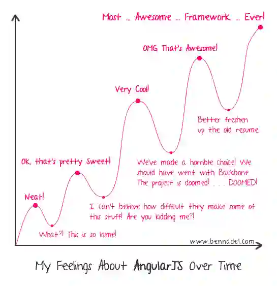 Angular 最突出的困难是其陡峭的学习曲线。它需要了解很多概念,而且并不是一下子直截了当给你的,很多时候会把你绕进死胡同。学好 Angular 是很困难的:它继承了 AngularJS 的学习曲线,但又有新的困难,比如 RxJS 或分层依赖注入。