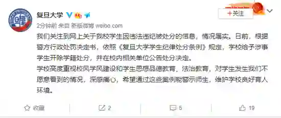我们关注到网上关于我校学生因违法违纪被处分的信息,情况属实。日前,根据警方行政处罚决定书,依照《复旦大学学生纪律处分条例》规定,学校给予涉事学生开除学籍处分,并在校内相关单位公告处分决定。