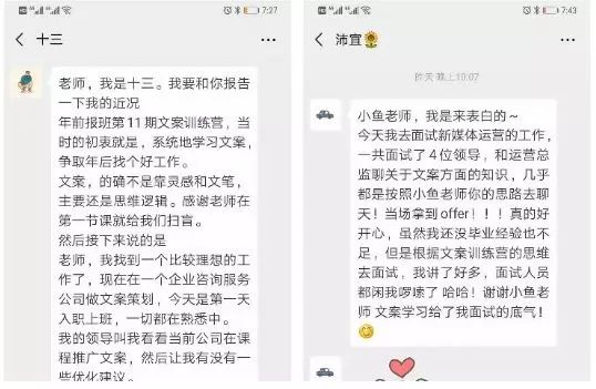 在这样的模式下,文案训练营的同学们,学完知识内容后→进行对应的练习→练习后及时收到专业的反馈,如此循环4周时间,小白想不大幅提升文案能力都难!