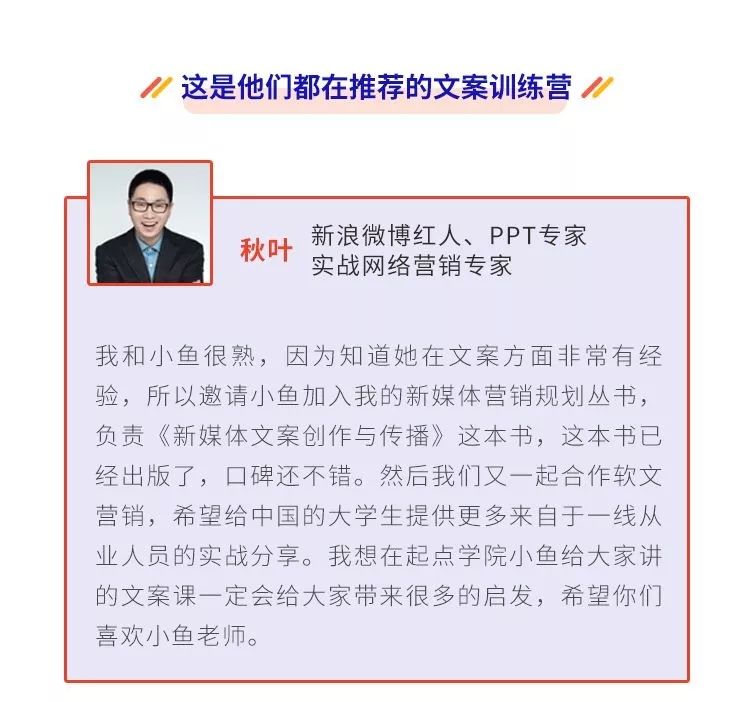 小鱼老师,为了做好课,曾花费20多万报名各种课,总结课程讲授方法,总结如何才能让同学们真正学会、并且能写出好文案。