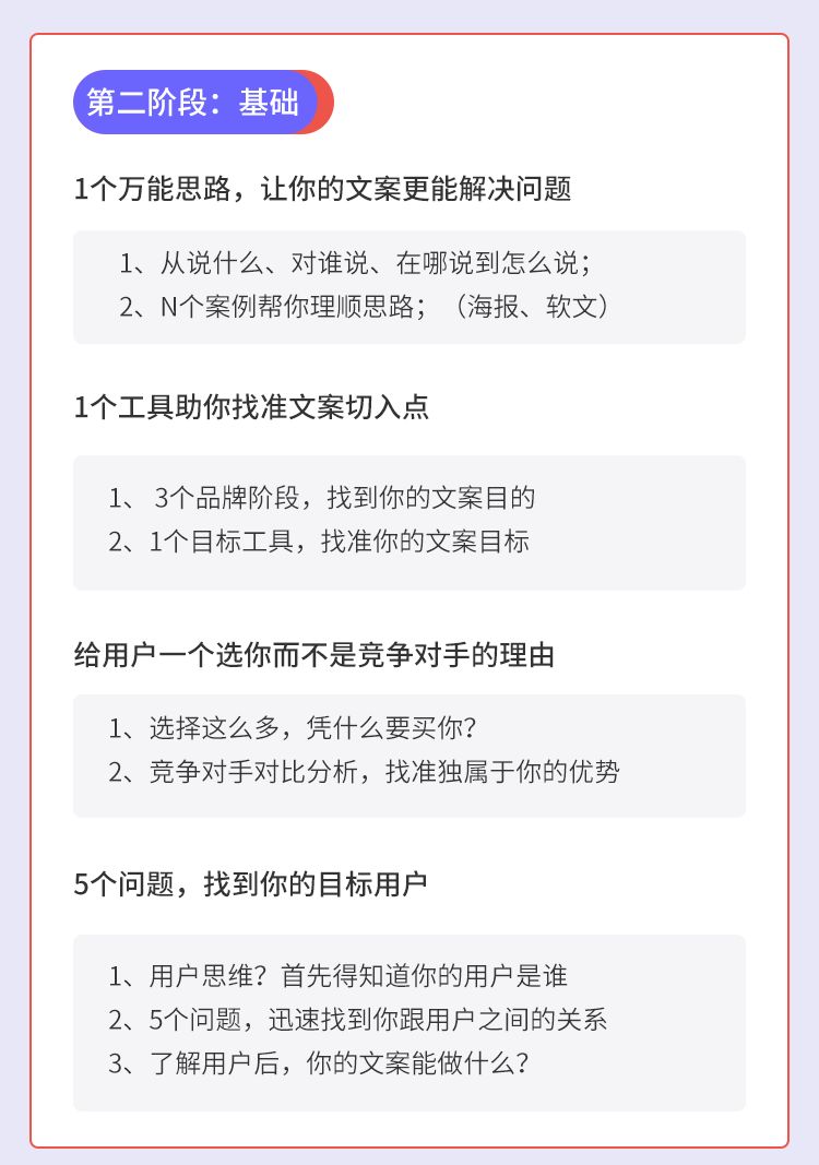 学完第二阶段,你的收获:将具备专业文案人才有的文案底层写作思维,用这套文案思维,写文案不再靠思路靠灵感,不再投放效果差。