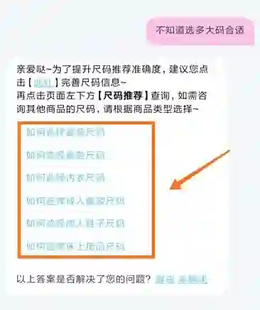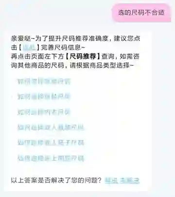 当用户输入“选的尺码不合适”时,其提问场景已经转变成用户收到货后,试穿之后发现尺码大了或小了,可能是需要退换货。而机器人返回仍然是如何选尺码的答案,很显然是打中了“选”和“尺码”两个关键字造成的误匹。从这个结果不难反推出如何选尺码的问题模板就是[选][尺码],只要用户输入的问句中包含这两个关键词,不管问的是什么问题,都会暴力匹配到这题。