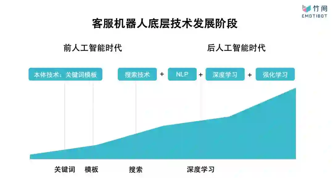 我们会将关键词模板称之为前人工时代,自然语言处理和深度学习称之为后人工时代。这两个时代划分的意义是,对话机器人已经有了浅层的语义理解。打个比方说就是,前人工智能时代的机器人的语言理解能力如果是婴儿的话,那么后人工智能时代的机器人就相当于3~4岁的儿童。