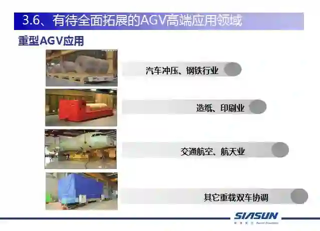另外还有些新的高端领域,比如我们关注重型AGV应用,汽车冲压、钢铁、造纸、印刷,交通航空,甚至重载双车协调,将来也是这个行业有价值推广的领域。