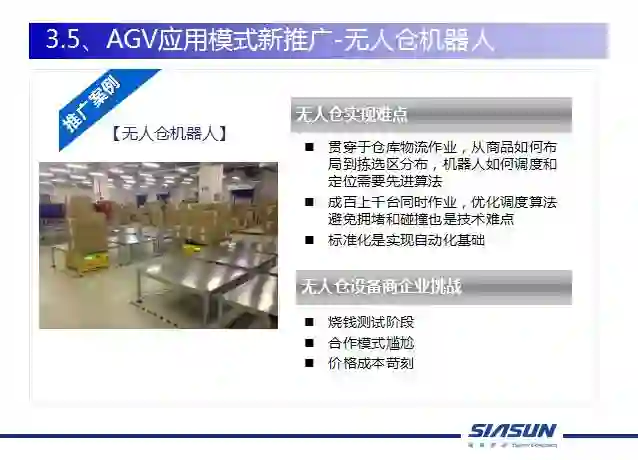 第三个推广模式是无人仓机器人,这个非常火热,包括创业的公司以及传统的AGV公司,都在关注无人仓技术。