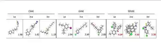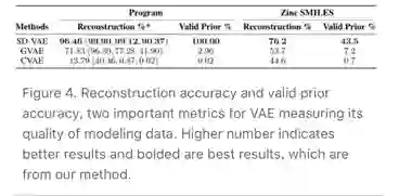 图6右边是CVAE、GVAE、SD-VAE三者效果的比较,结果表明,语法导向的变分自动编码器(SD-VAE)效果最好。