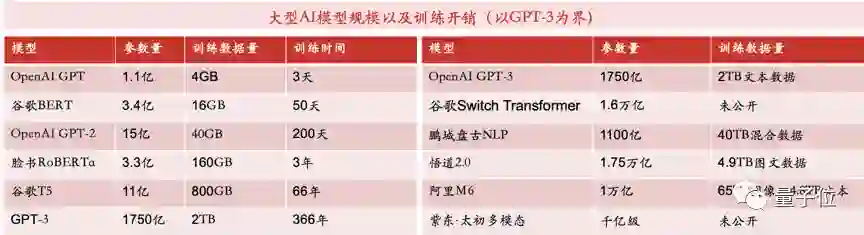 举个例子,比如像open AI GPT,只需要3张英伟达的A100训练三天,但使用单卡,就需要训练366年。像GPT-3模型,则需要1024张80GB的显卡,训练一个月,训练成本超过1200万美金。如果训练北京智源研究院的“悟道”模型,整个花费也是达数千万美元。图1所示:我们可以看到以GPT-3为界,左边这个图里模型到了GPT-3以后,switch transform、悟道、阿里M6等等都是千亿到万亿的模型参数计算量。
