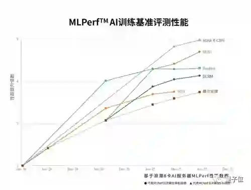 而从另外一个维度看,能够提升芯片性能的,无非就是制程和架构。图2是展示了基于浪潮8卡AI服务器做MLperf性能数据,计算性能已经超过了摩尔定律发展,这意味着架构创新起了非常大的作用。随着时间的推移,芯片架构创新对性能提升的影响会越来越大。性能的提升跟摩尔定律的“剪刀差”会越来越明显。