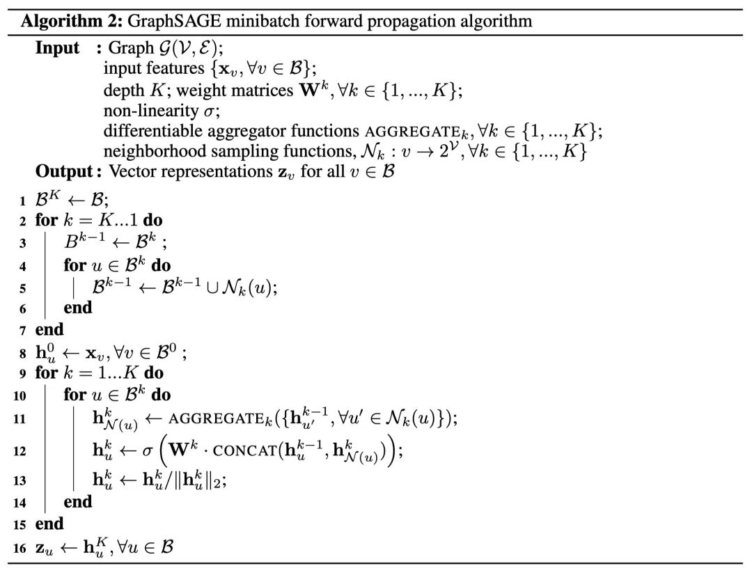 假设GraphSAGE已经训练好,我们可以通过以下步骤来获得节点embedding,具体算法请看下图的算法1。