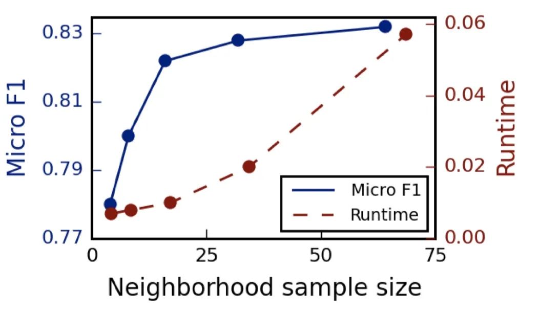 实验中也有关于邻居采样数量的对比,如下图,随着邻居抽样数量的递增,边际效益递减,而且计算时间也会增大。
