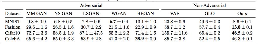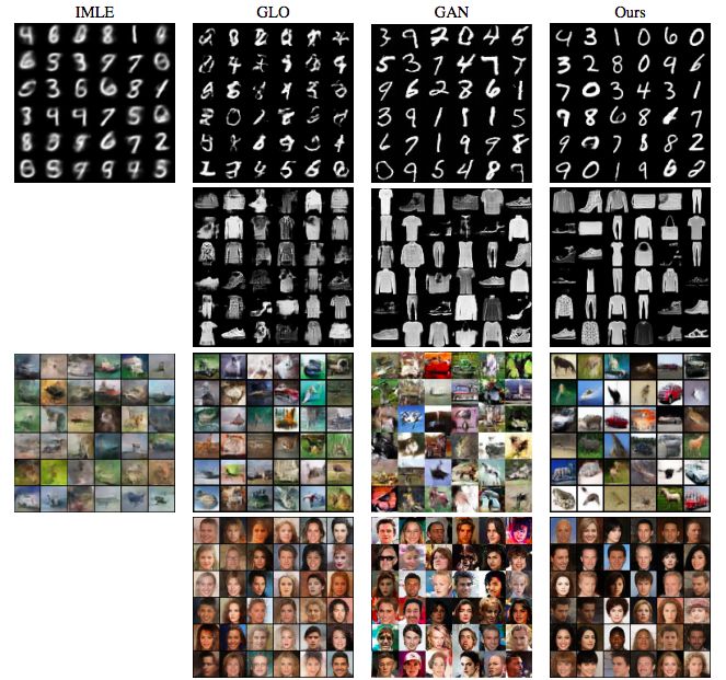 GAN 的缺陷让研究者开始探索用非对抗式方案来训练生成模型,GLO 和 IMLE 就是两种这类方法。Bojanowski et al. 提出的 GLO 是将训练图像嵌入到一个低维空间中,并在该嵌入向量输入到一个联合训练的深度生成器时重建它们。GLO 的优势有:1)无模式丢失地编码整个分布;2)学习得到的隐含空间能与图像的形义属性相对应,即隐含编码之间的欧几里德距离对应于形义方面的含义差异。但 GLO 有一个关键缺点,即没有一种从嵌入空间采样新图像的原则性方法。尽管 GLO 的提出者建议用一个高斯分布来拟合训练图像的隐编码,但这会导致图像合成质量不高。