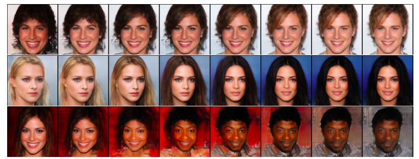 图 4:在 CelebA-HQ 上以 256×256 的分辨率得到的插值实验结果。最左边和最右边的图像是根据随机噪声随机采样得到的。中间的插值图像很平滑而且视觉质量很高。