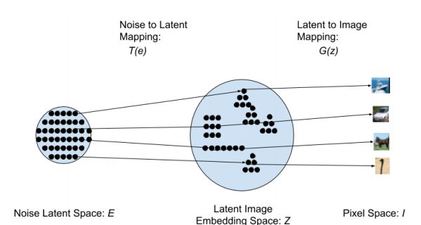 图 1:我们的架构的示意图:采样一个随机噪声向量 e 并将其映射到隐含空间,得到隐含编码 z = T(e)。该隐含编码再由生成器投射到像素空间,得到图像 I = G(z)