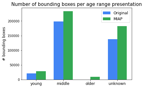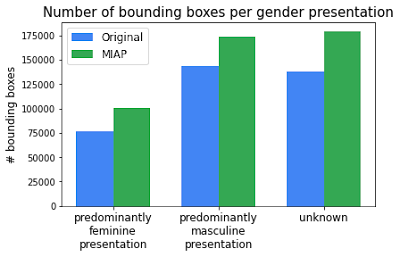 原始 Open Images 和新 MIAP 数据集之间人物边界框数量的比较