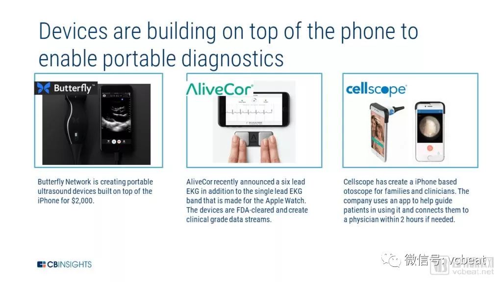 一些初创公司也利用搭载到iPhone上的功能,将诊断设备变得更为便携,例如Butterfly Network (便携式超声波), AliveCor(多导联ECG)和Cellscope (iPhone耳镜)。