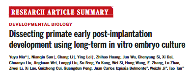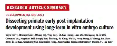 2019年,季维智院士团队谭韬、牛昱宇课题组与美国索尔克研究所、德克萨斯大学西南医学中心、深圳华大基因研究院合作在Science发表研究成果揭示了体外培养的灵长类动物早期胚胎发育图谱。