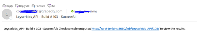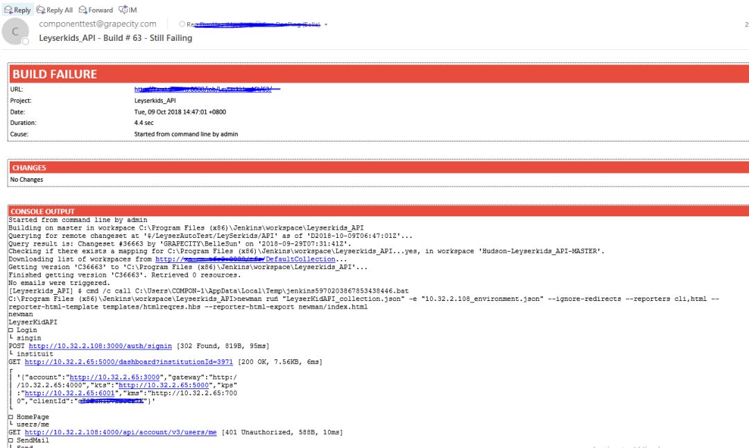 经过以上步骤的配置,构建完成之后,会收到邮件,根据链接在console output查看构建结果,不是很直观。下一步中将进行改善。
