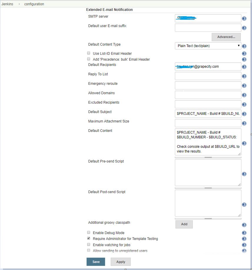 Jenkins主页->Manage Jenkins->Configure System-> Extended E-mail Notification, 配置邮件Server