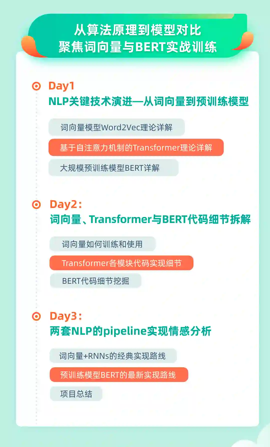本次训练营为期3天,主要分为三个模块。NLP关键技术演进-从词向量到预训练模型;词向量、Transformer与BERT代码细节拆解;两套NLP的Pipeline实现情感分析。