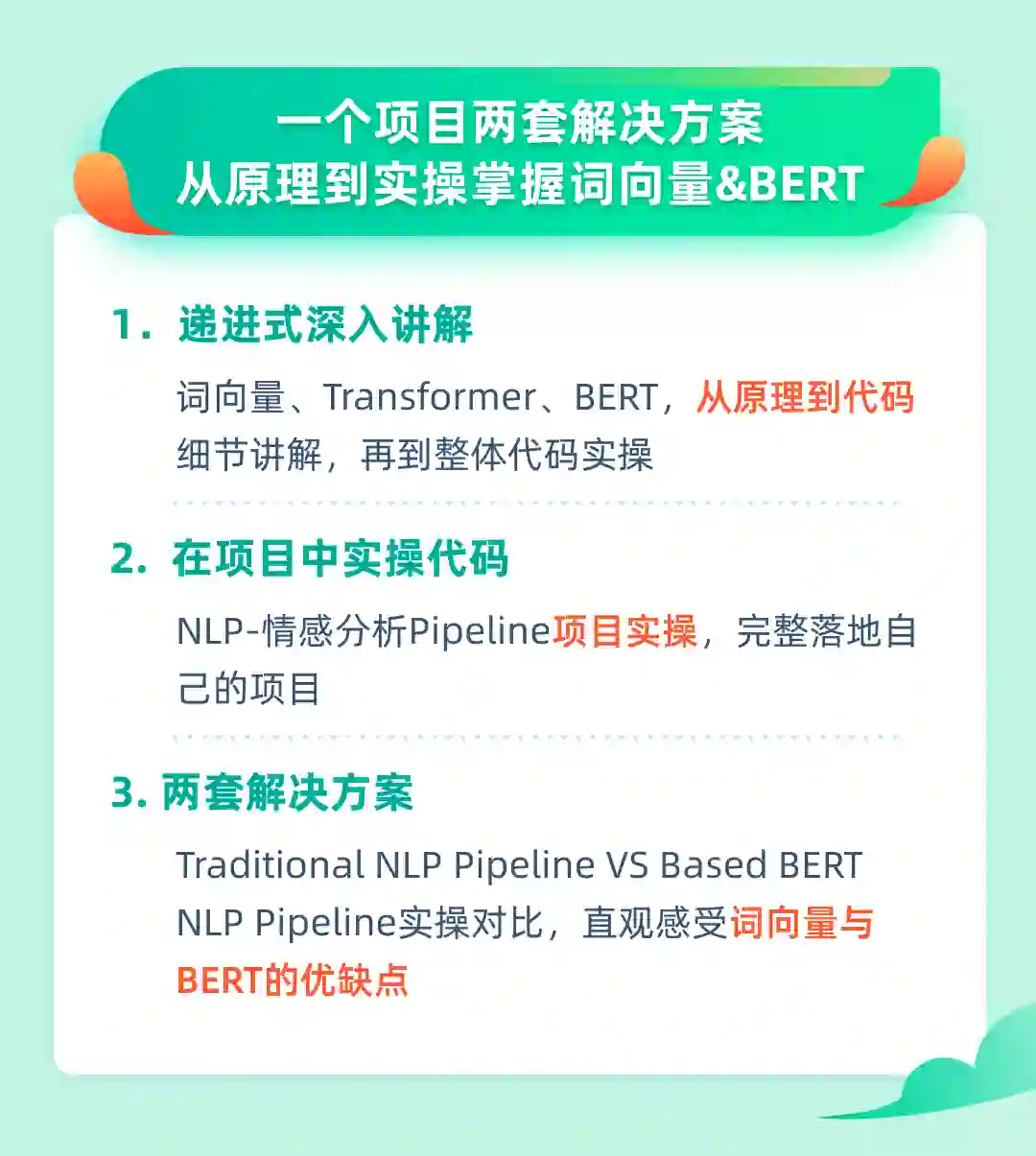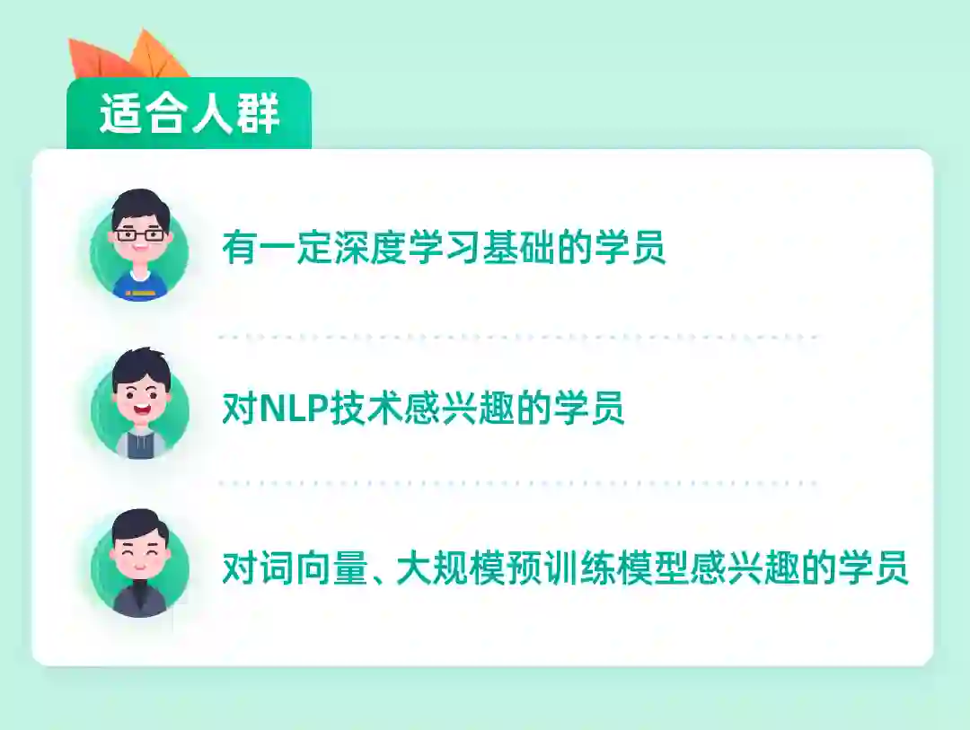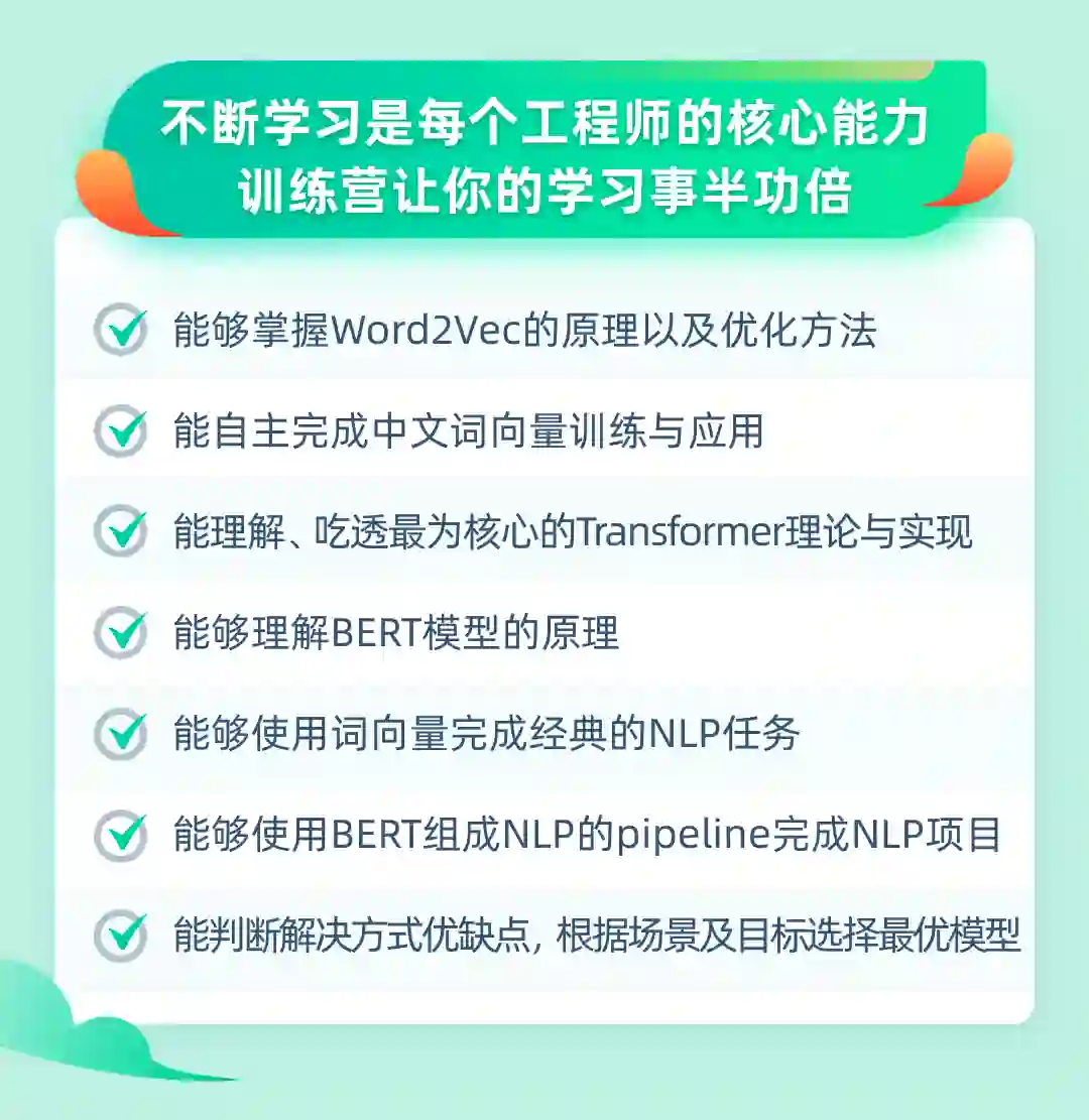 如果你是以上人群,那么这次训练营十分适合你。从原理到实操掌握词向量&BERT,让你业务实战能力up!快速实现升职加薪!