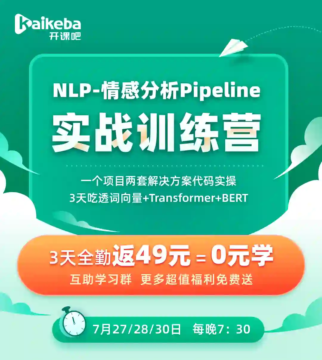 不懂情感分析,你在面试NLP算法工程师的时候很吃亏。本号强烈推荐你参加《NLP-文本情感分析Pipeline实战训练营》,前百度算法工程师带你用两套NLP的Pipeline来实现情感分析。让你快速上手相关工作。内容不错,推荐给你们。