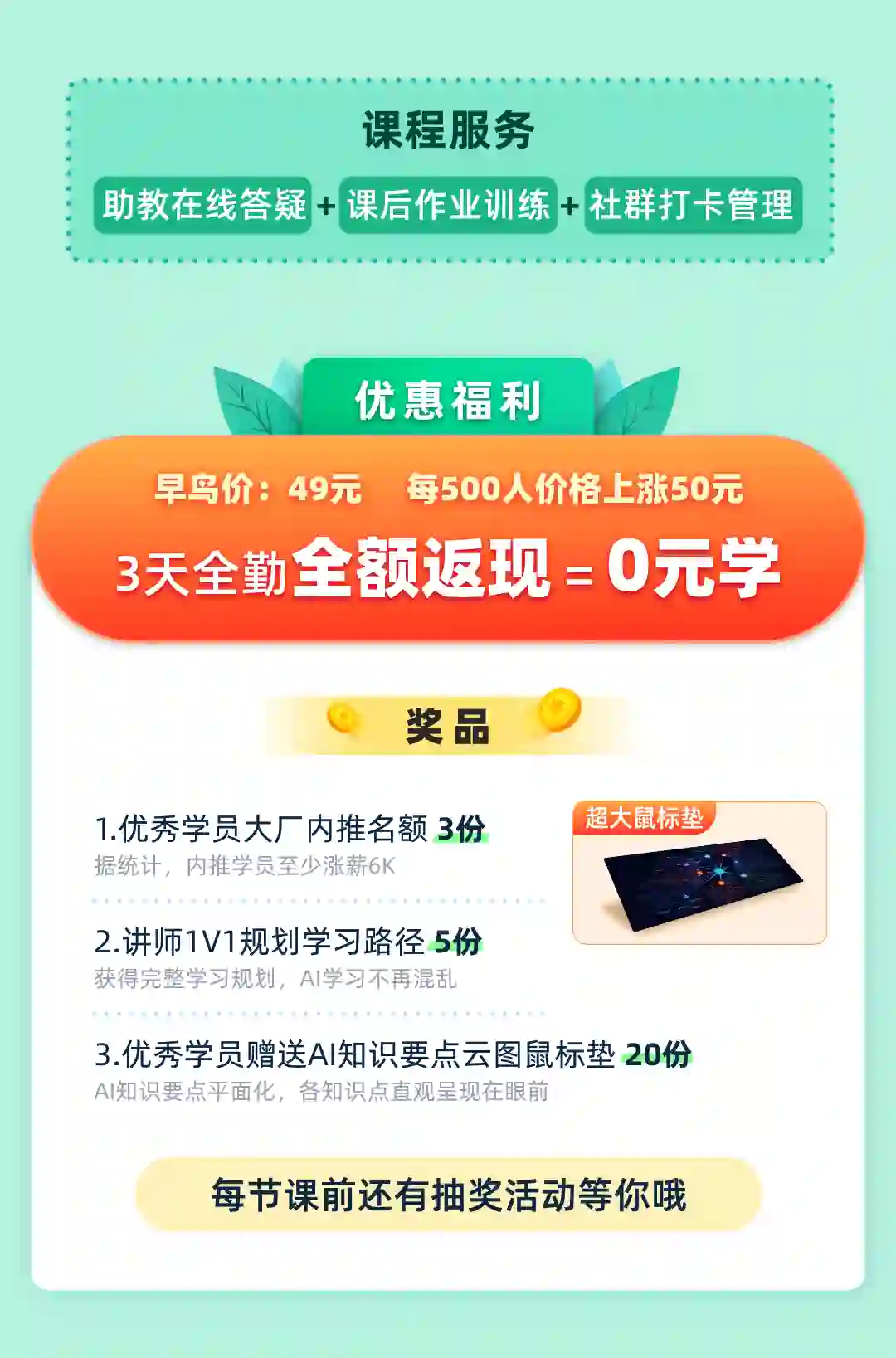 你只需支付 49元 的预定金,然后做到 3 天课程全勤 , 49 元预定金会在结课后 7 个工作日内全部退给大家。这些标准其实并不难,如果你态度认真,很轻松就能做到。