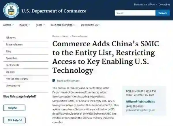 中芯国际被美国打压早已不是第一次。去年12月,美国商务部以保护美国国家安全和外交利益为由,将中芯国际及其部分子公司及参股公司列入「实体清单」。