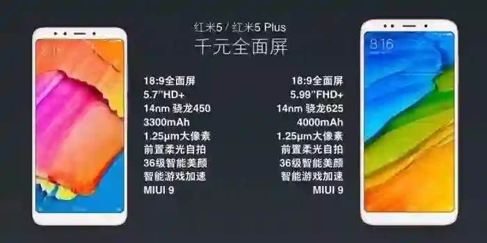 12 月 7 日,小米在北京发布了两款新机红米 5 以及红米 5 Plus。两款手机均采用当下流行的 18:9 全面屏,小米称其为有史以来最漂亮的红米手机,售价上小米又将全面屏的技术压到了最低价,仅仅 799 起售。红米 5 配备了 5.7 英寸 18:9 全面屏,分辨率是 1440×720 像素,搭载的是骁龙 450 处理器,内置 3200mAh 容量电池。红米 5 Plus 则配备 5.99 英寸 18:9 全面屏,分辨率是 2160×1080 像素,搭载骁龙 625 处理器,内置 4000mAh 容量电池。